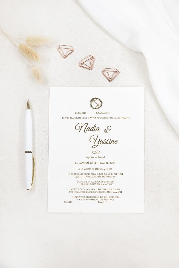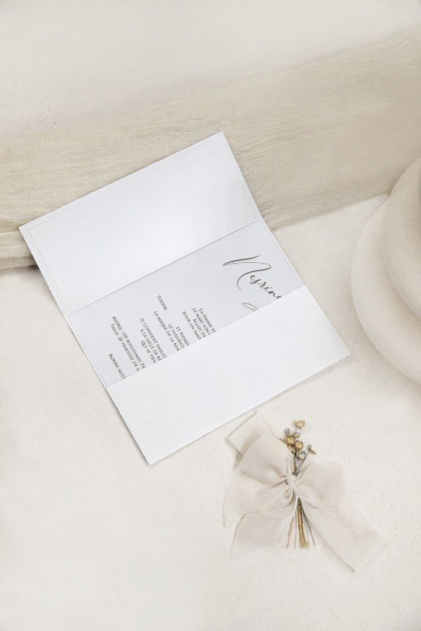 Ce faire-part est composé de deux cartons d’invitation (texte + programme) délicatement liés par un ruban blanc.