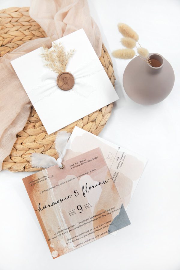 Ce faire-part est composé de deux cartons d’invitation (texte + programme) délicatement liés par un ruban blanc.