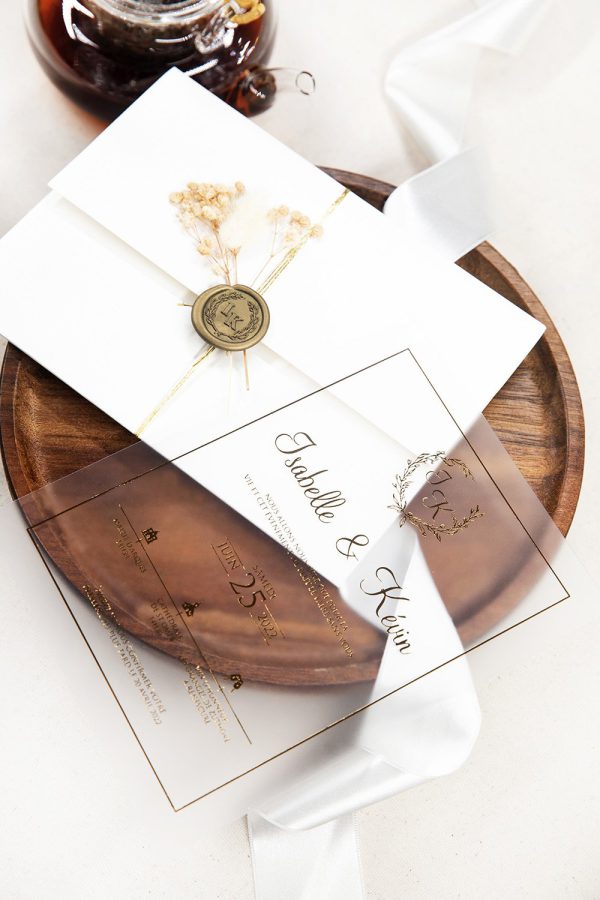 Composantes du produit : pochette : Japon Bristol gris - 320 gr / carton d'invitation : plexi 100% transparent