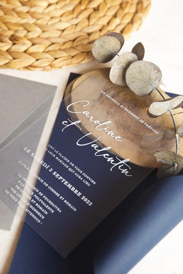 Composantes du produit : pochette : Japon Bristol gris - 320 gr / carton d'invitation : plexi 100% transparent