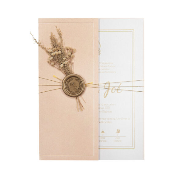Composantes du produit : pochette : papier métallisé pailleté rose - cartons d'invitation : papier toile blanche 250 gr