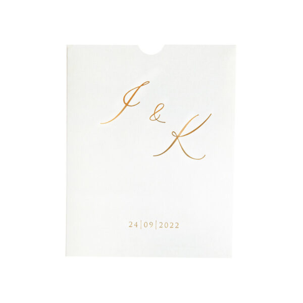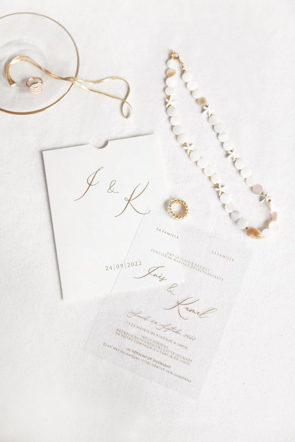 Sa carte transparente ornée de lettres dorées ainsi que sa pochette blanche gravée à vos initiales sauront épater vos invités !