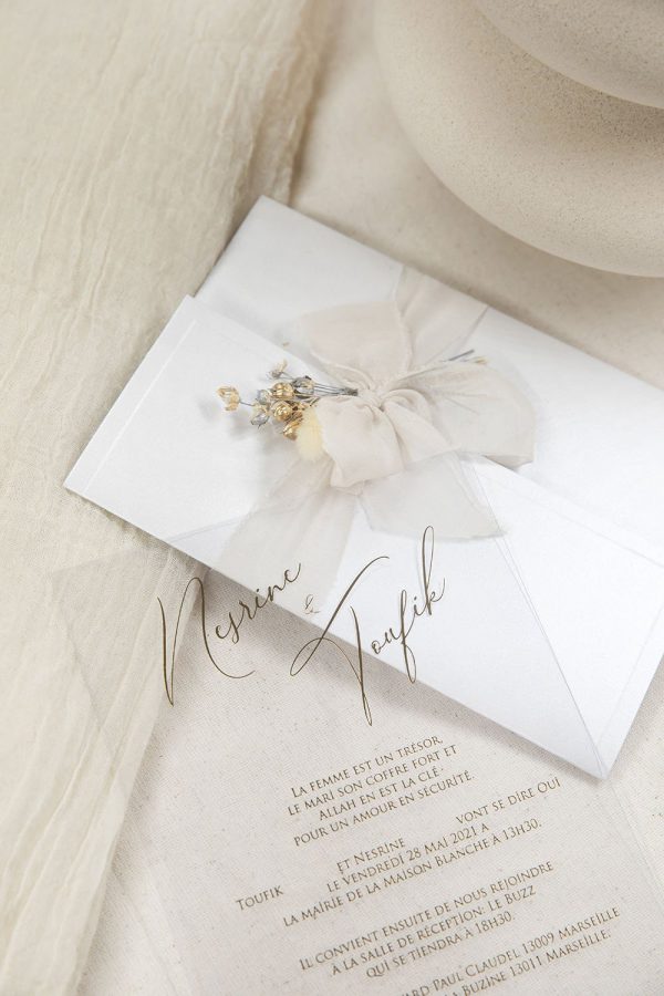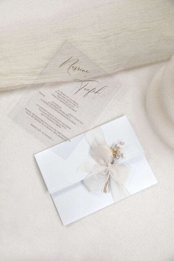 Sa carte en plexi 100% transparente ornée de lettres dorées sera la touche d’élégance d’excellence pour l’annonce de votre jour J.